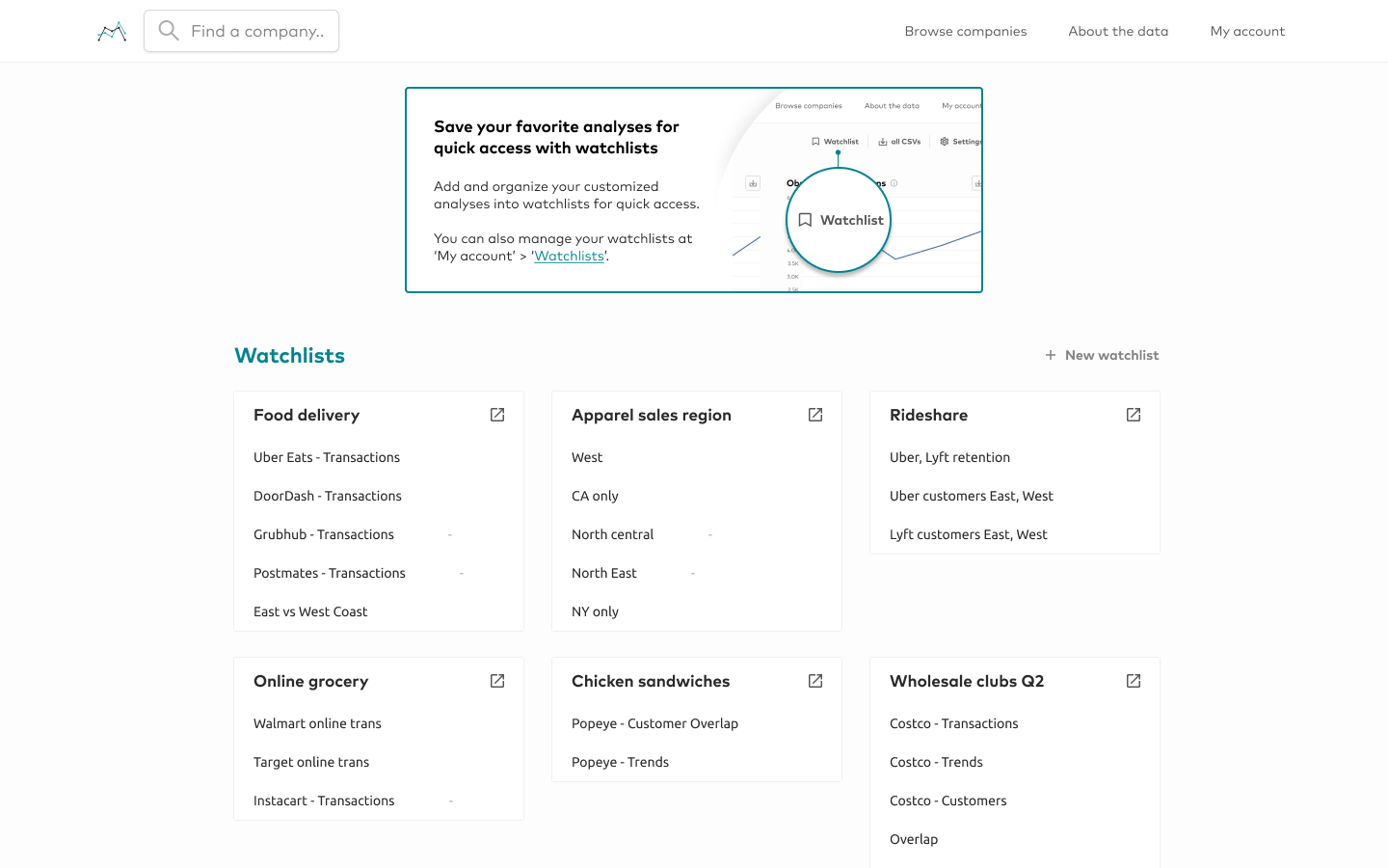 Replacing a previous 'design' that was mostly irrelevant, introducing the watchlist feature on the homepage provides greater visibility and encourages user adoption. Due to technological constraints, the best solution was to enable subscribers to open all their saved analyses in a group at once as new tabs with a click of a button.
